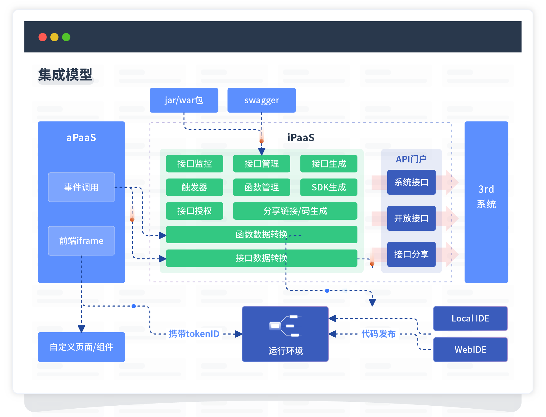 集成模型包括平台本身前 、、、后端能力的扩展,,,也支持通过API门户和第三方系统进行交互。。。