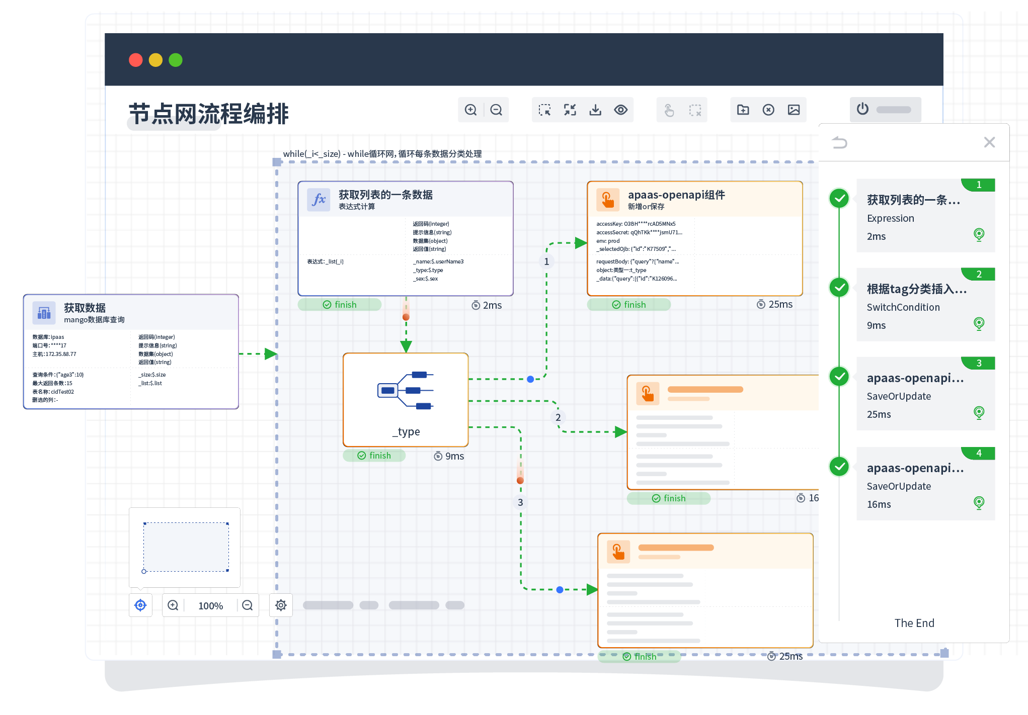 针对集成场景,,,组件定义后支持进行流程编制,,,不同于传统代码方式,,,通过图形化展示,,,支持在线调试 、、、日志查看和运行回放。。。
